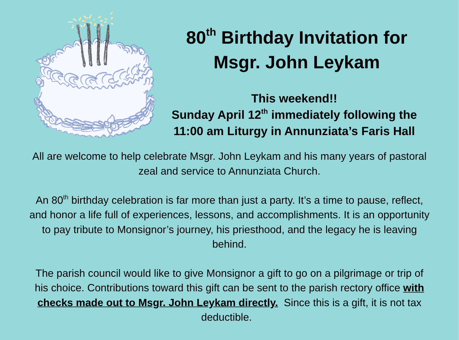 Our here at Annunziata and our second-grade class will receive the Sacrament of the Holy Eucharist for the first time on Saturday May 2nd, let us pray for these young men and women as they prepare of their first communion. Also, many marriages take place here at the Church of the Annunziata during Easter time, let us all also pray for these couples as they prepare to share their lives together in the Sacrament of Marriage. Lastly, but very importantly on Saturday May 23, 2026, Archbishop Rozanski will ordain one man to the priesthood, to be of service to the people of God. Finally during this joyful season of Easter let us pray for our Pope Leo that he be guided and strengthened by the workings of the Holy Spirit and Archbishop Mitchell Rozanski as he guides our Archdiocese. As you can see, we are truly a richly blessed Church.